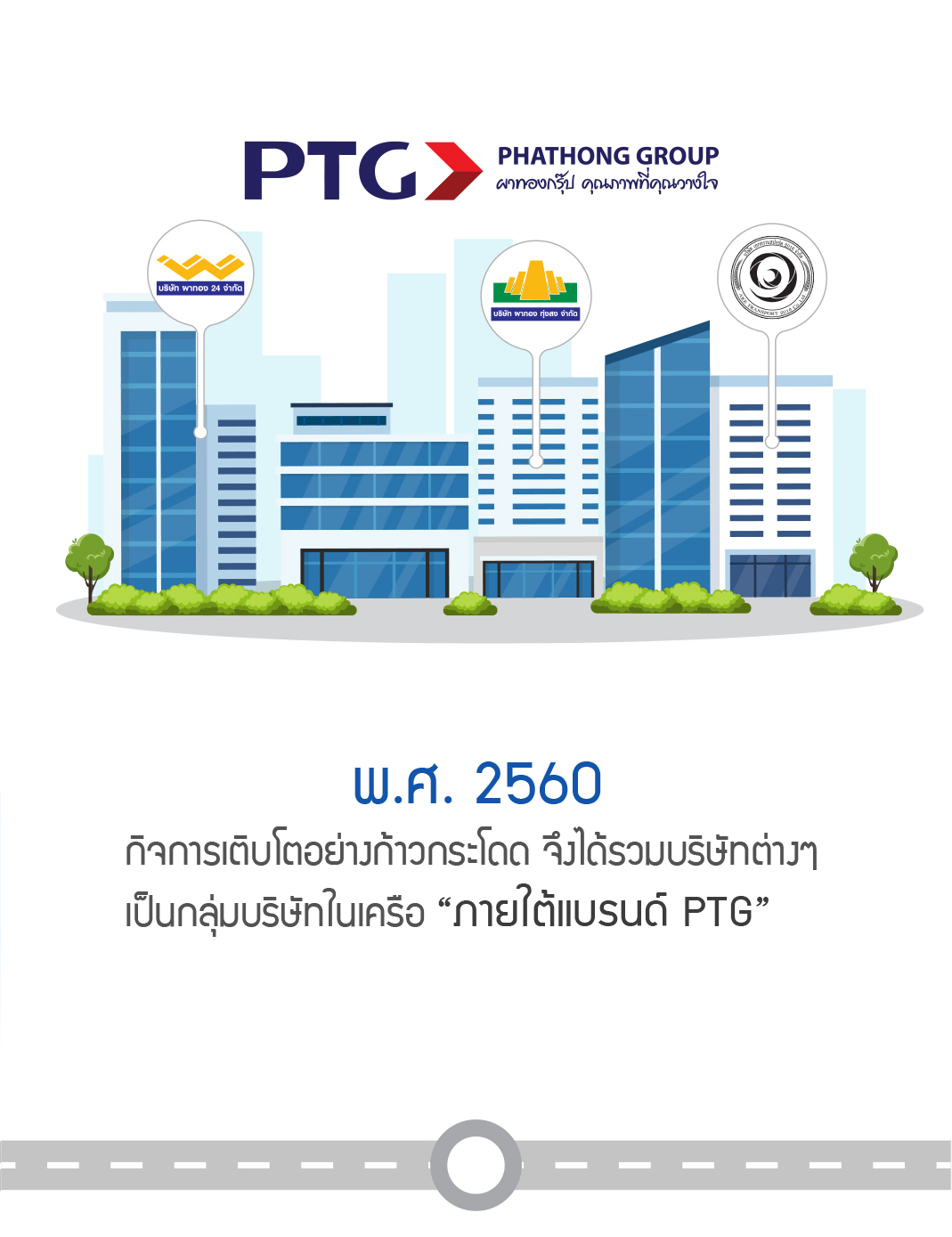 และผ่านมาแล้ว "กว่า 45 ปี" ด้วยวิสัยทัศน์ที่ก้าวไกลของผู้บริหาร ประสานกับความร่วมมือจากบุคลากรทุกๆ ท่าน ทำให้ "PTG (ผาทองกรุ๊ป)" เติบโตขึ้นอย่างแข็งแกร่ง มั่นคง พร้อมยกระดับจากบริษัทภายในภูมิภาคสู่บริษัทระดับประเทศ เราจะยืนหยัดเคียงข้างและก้าวต่อไปอย่างมั่นคง