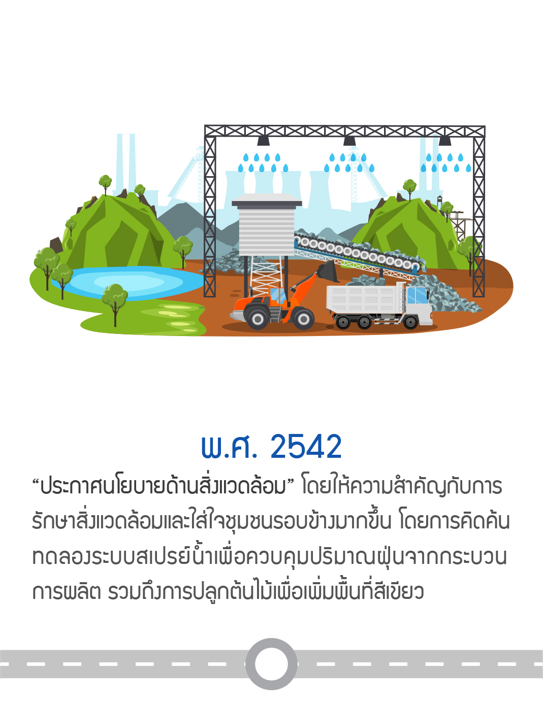 "ประกาศนโยบายด้านสิ่งแวดล้อม" โดยให้ความสำคัญกับการรักษาสิ่งแวดล้อมและใส่ใจชุมชนรอบข้างมากขึ้น โดยการคิดค้นทดลองระบบสเปรย์น้ำเพื่อควบคุมปริมาณฝุ่นจากกระบวนการผลิต รวมถึงการปลูกต้นไม้เพื่อเพิ่มพื้นที่สีเขียว