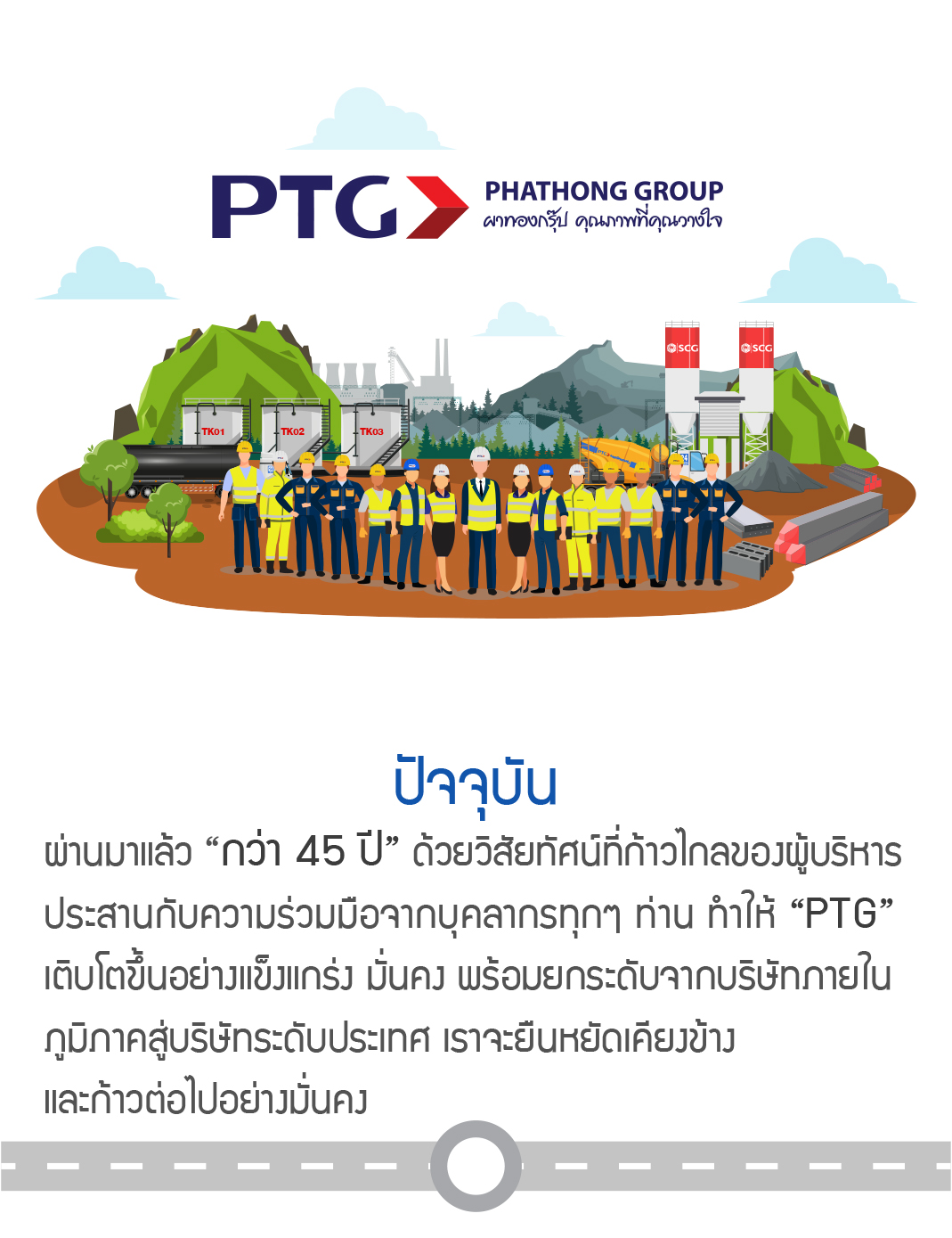 และผ่านมาแล้ว "กว่า 45 ปี" ด้วยวิสัยทัศน์ที่ก้าวไกลของผู้บริหาร ประสานกับความร่วมมือจากบุคลากรทุกๆ ท่าน ทำให้ "PTG (ผาทองกรุ๊ป)" เติบโตขึ้นอย่างแข็งแกร่ง มั่นคง พร้อมยกระดับจากบริษัทภายในภูมิภาคสู่บริษัทระดับประเทศ เราจะยืนหยัดเคียงข้างและก้าวต่อไปอย่างมั่นคง